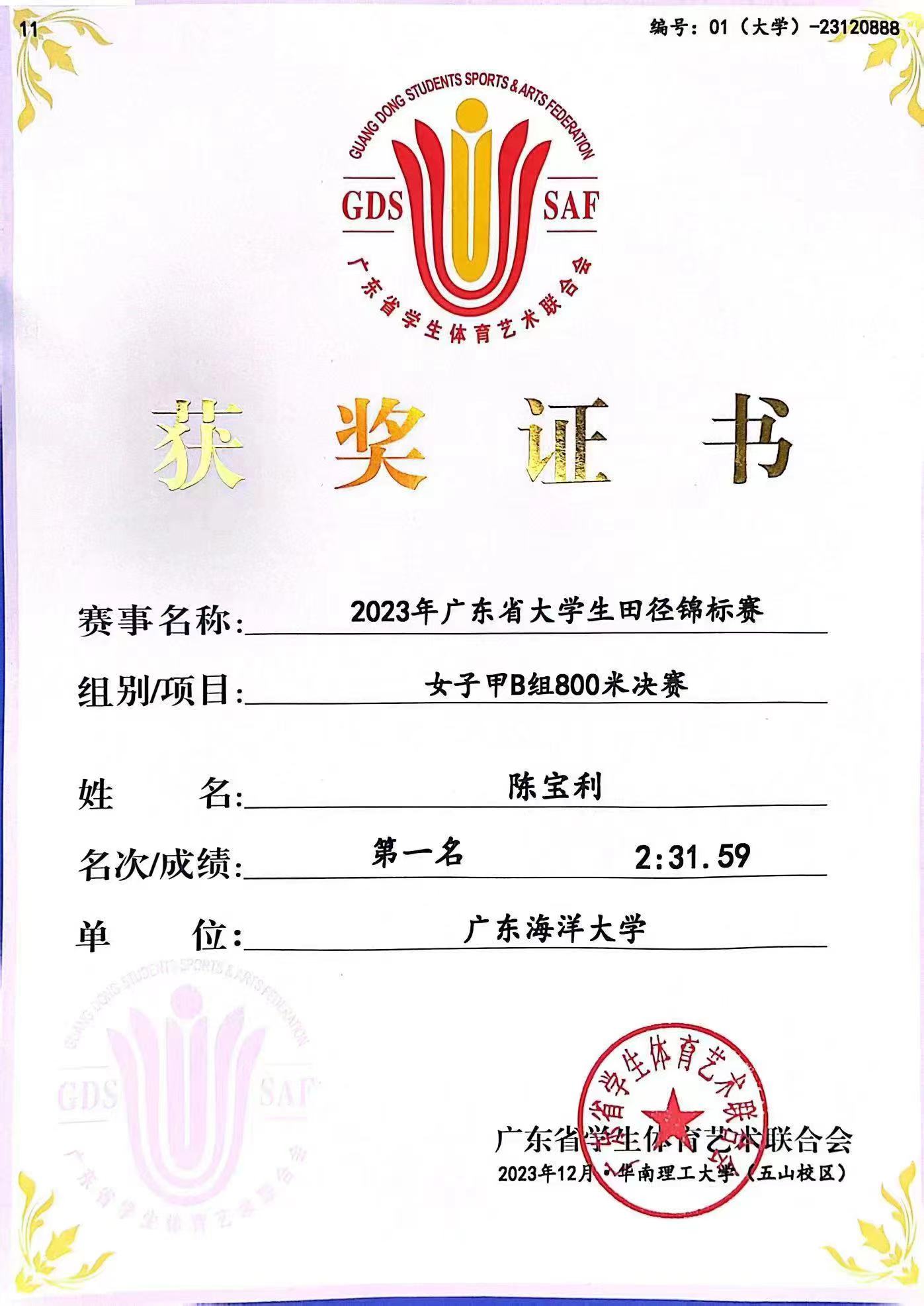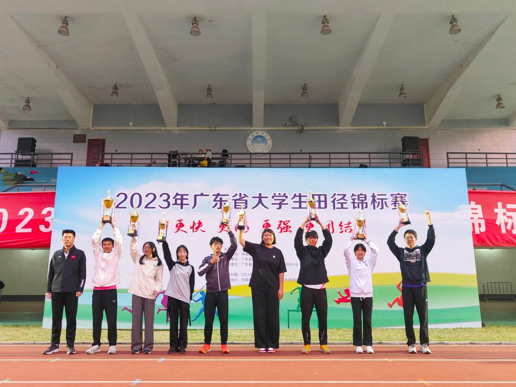 12月1-3日,2023年广东省大学生田径锦标赛在华南理工大学(五山校区)举行。我校陈宝利同学包揽女子甲组800米、1500米双金,张俊喆同学包揽男子甲组跳远、男子三级跳远双银。刘培荣、冯金莹同学分获男子甲组5000米、女子甲组标枪季军。我校获团体总分(甲B)第七名,成功晋级至甲A组。刘海清等三位老师被评为“优秀教练员”,为我校争得荣誉。