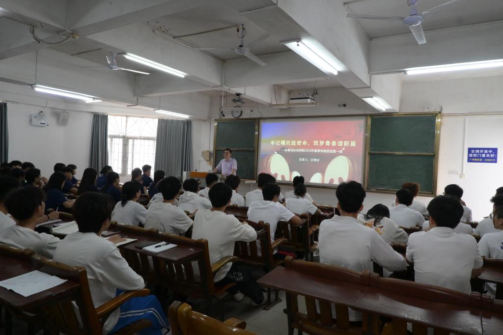 为贯彻落实教育部等十部门《全面推进“大思政课”建设的工作方案》精神,根据广东省教育厅《关于做好2024年春季学期大中小学校党组织书记、校长上第一堂思政课工作的通知》要求,william英国中文于2024年3月27日下午在广学楼222教室开讲2023-2024学年春季学期思政第一课,学院全体学生党员、党员发展对象、入党积极分子、第七期“青马班”学员以及学院团委学生会干部约80余人参加了学习。本次思政课由学院党委书记王明对主讲。