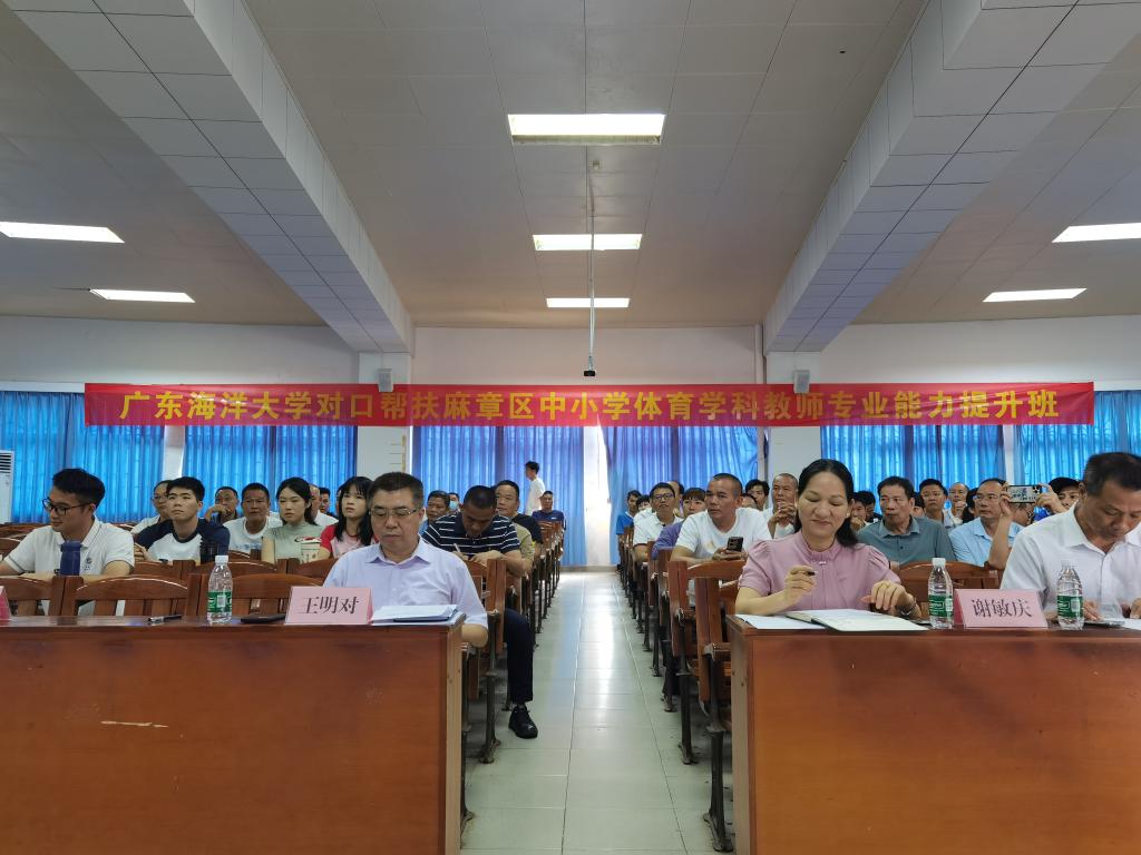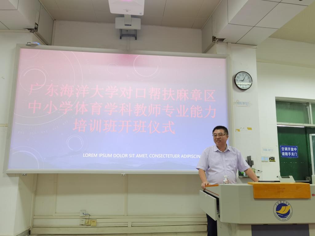 王明对书记作了开班动员讲话,他指出,为深入学习贯彻习近平总书记关于教育和体育的论述精神,推动广东基础教育高质量发展,落实粤东西北中小学体育学科教师专业能力提升帮扶工作,体育与休闲学院承办对口帮扶麻章区中小学体育学科教师专业能力提升培训班,助力地方“百千万”工程,提升麻章区中小学体育教师素质和能力,学院为此做了大量准备工作,并精心选聘高水平专家授课,在课程设置和课题选择方面做了精心安排,本次培训既有专家专题讲授,还安排有现场教学和实操课程,培训内容丰富,形式多样,针对性强。培训期间,学院将加强与麻章区教师发展中心沟通协调,认真组织做好各项教学活动和后勤保障工作,尽可能为学员提供优质服务。同时希望参训学员珍惜学习机会,遵守学习纪律,学思践悟,知行合一。谢敏庆副主任对海大的帮扶培训给予诚挚感谢并对参训学员提出学习要求,学员代表麻章中学体卫主任谢秋才做了表态发言。