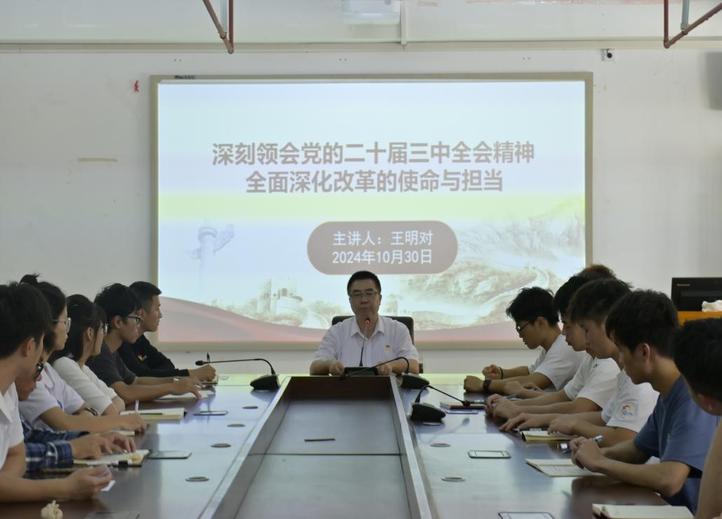 王明对书记围绕党的二十届三中全会的时代背景及其深远的历史意义,对全会精神进行了全面而系统的讲解,精准提炼其核心要义、丰富底蕴与精神实质。王明对书记巧妙地将话题延伸至中国式现代化的发展浪潮中,启发同学们将个人理想融入国家发展的宏伟蓝图之中,激励他们不仅要致力于个人品德与学识的双重提升,更要勇于承担起推动社会进步的责任,成为中国式现代化的积极践行者。