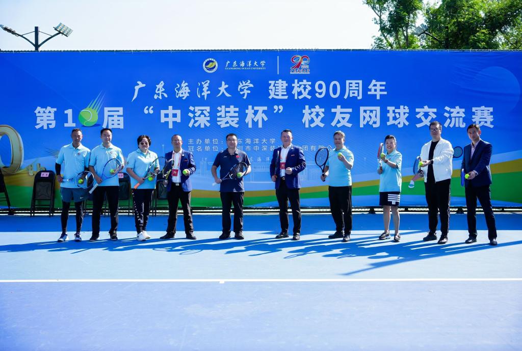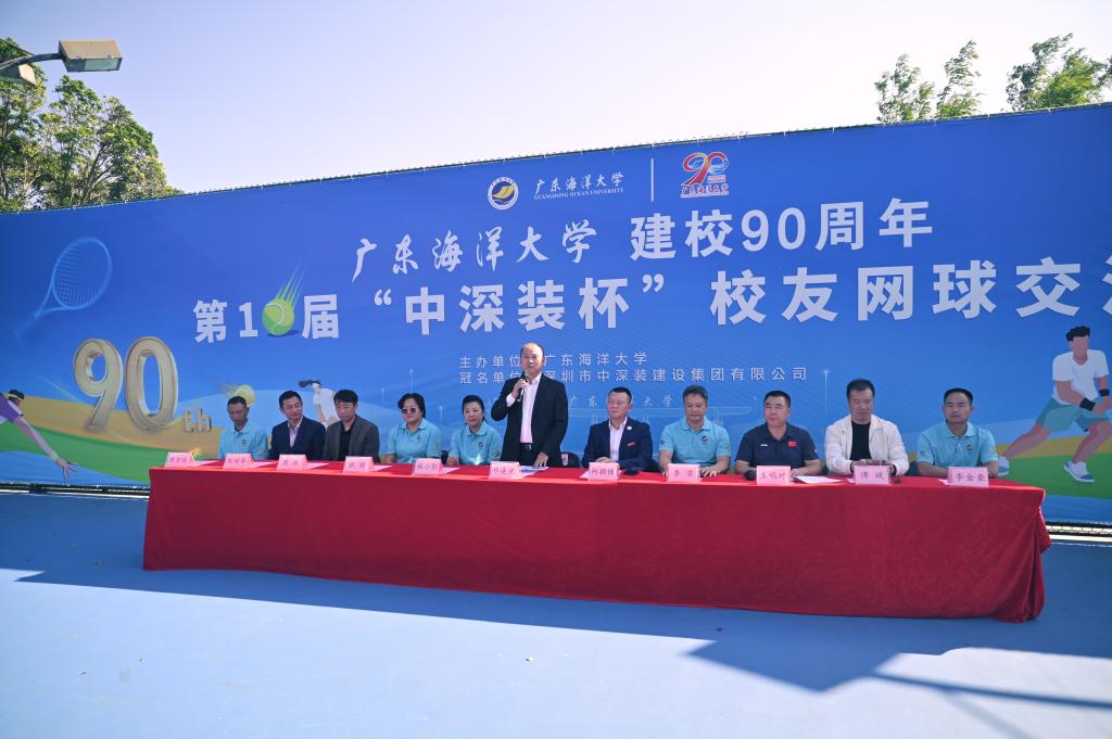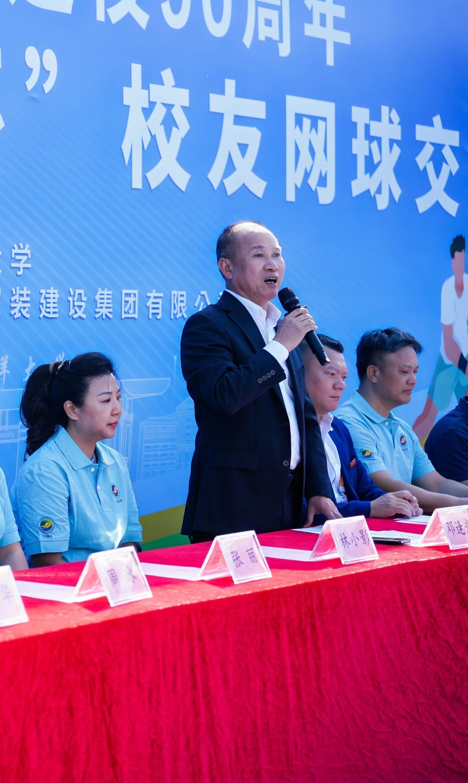 学校党委常委、副校长邓逢光,深圳市中深装建设集团有限公司董事长、深圳校友会会长柯颖锋出席开幕式并分别致辞,2022 级学生曹泽承代表在校学子送上真挚祝福。湛江移动公司副总经理詹艳桃、湛江网球协会会长李常、揭阳市网球协会会长林小影、快能 (东莞) 体育科技有限公司总经理张丽和学院党委书记王明对、院长周冰、副书记谭斌、副院长施俊华、刘培华等领导老师莅临现场,与近120位跨越山海而来的海内外校友、师生代表齐聚一堂,以网球为纽带,赴一场镌刻青春记忆、赓续同窗情谊的相聚之约,用运动激情续写与母校的深厚羁绊,让“广学明德 海纳厚为”的校训精神在赛场之上熠熠生辉。