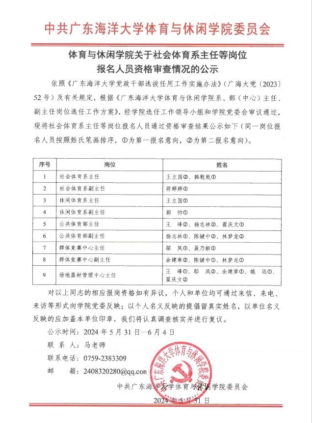 william英国中文关于社会体育系主任等岗位报名人员资格审查情况的公示