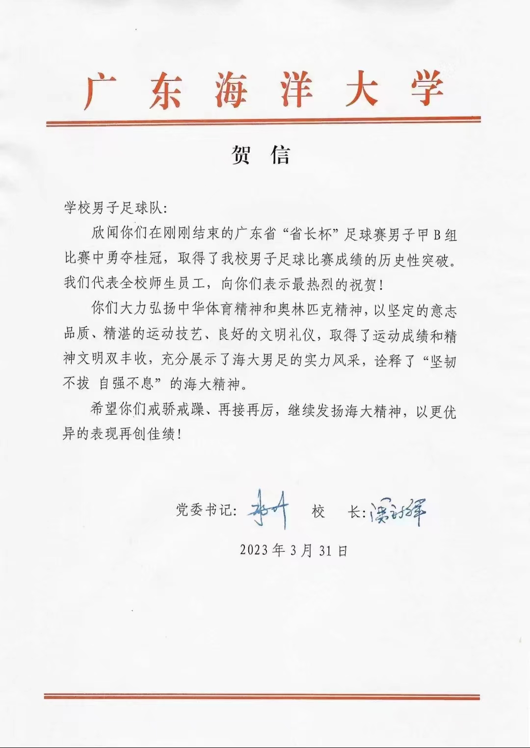 我校足球队在学校领导的大力支持下,积极备战,奋力拼搏,经过7场比赛的激烈角逐,荣获冠军,为学校争得荣誉,学校党委书记杨洲、校长潘新祥为此写了贺信。